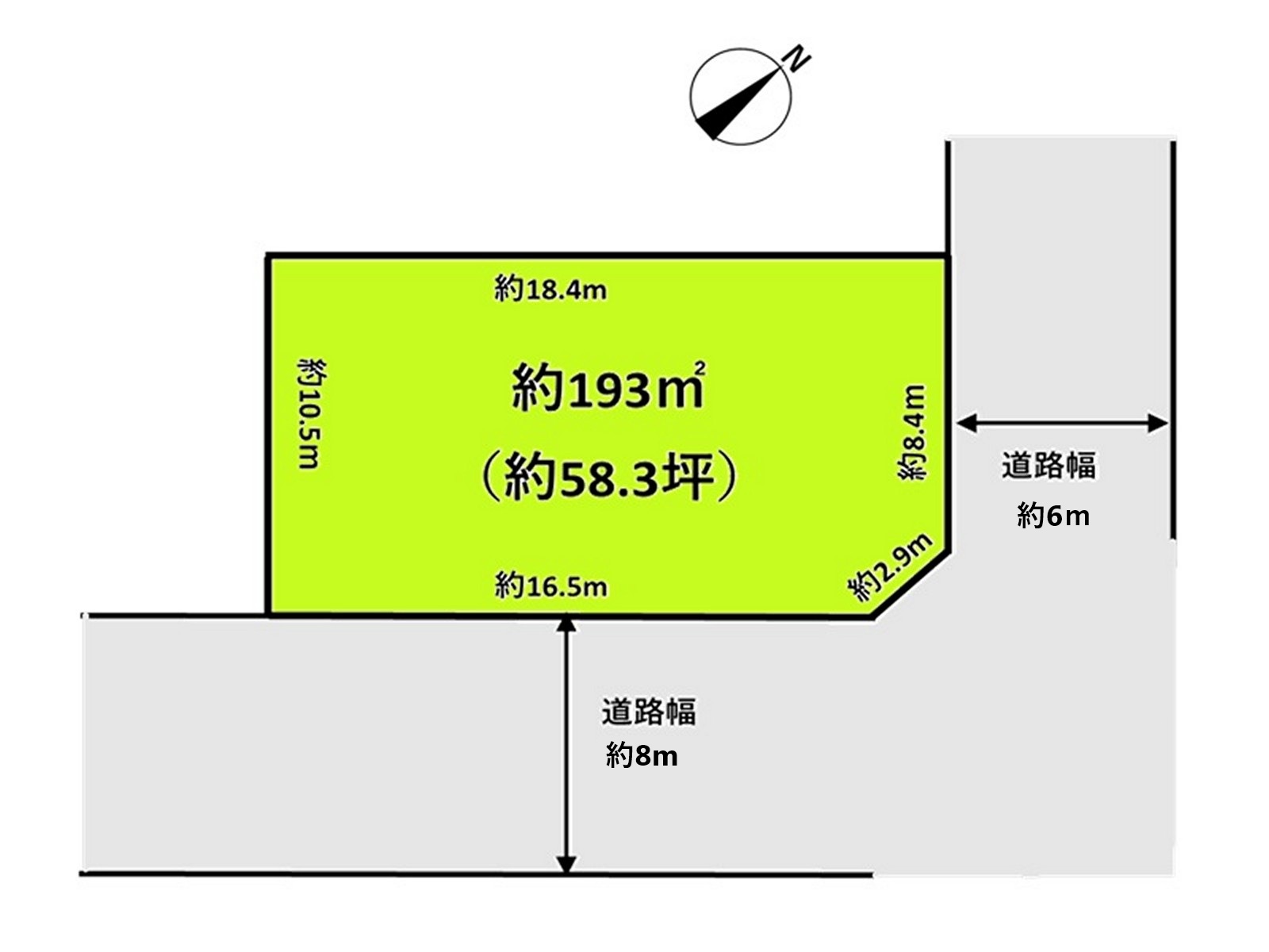 接道情報 | 北東側幅員約6.0m、南東側幅員約8.0mの公道に接する(角地) |